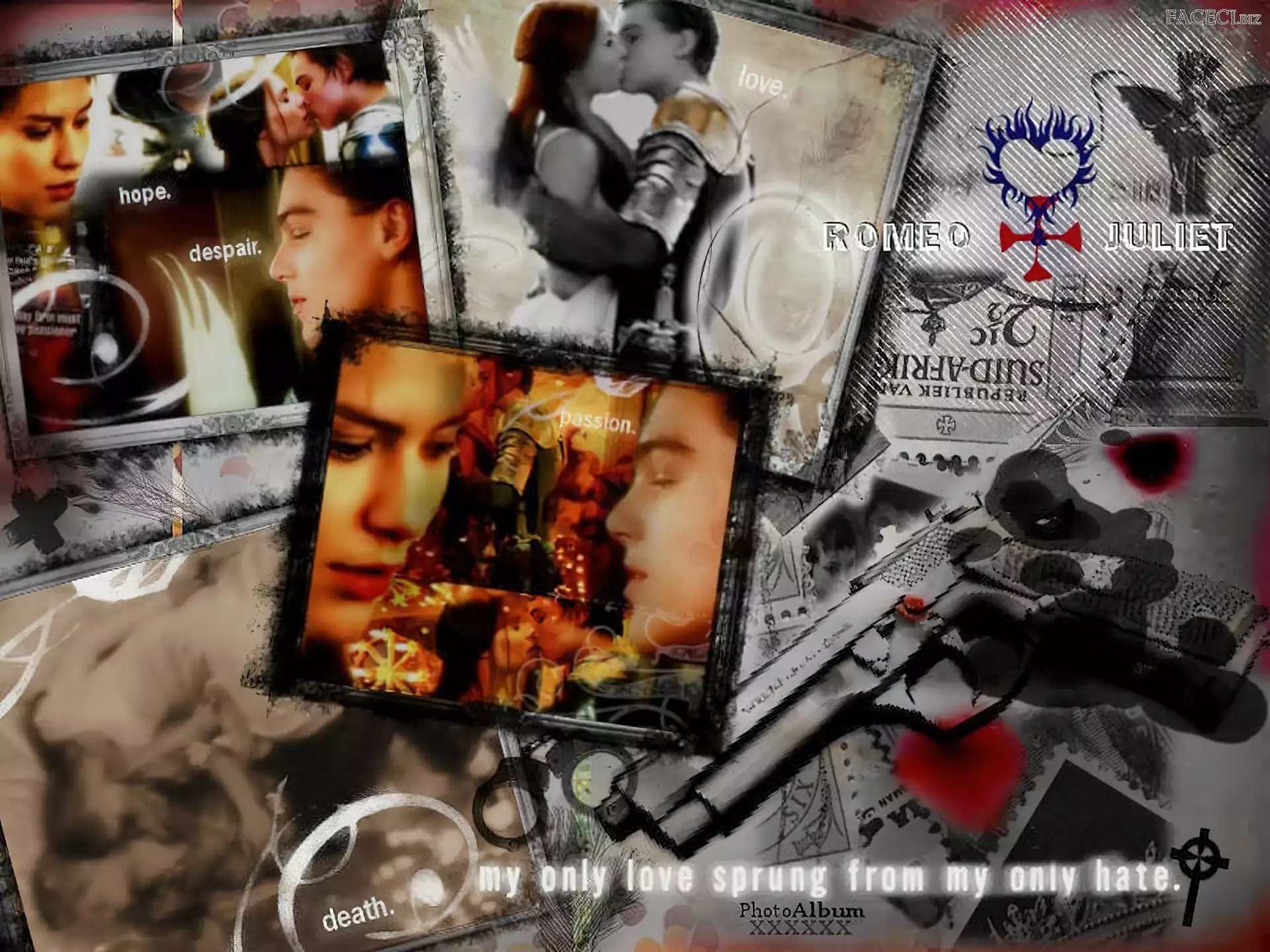 pocałunek, zdjęcia, rewolwer, Romeo And Juliet, Leonardo DiCaprio - faceci.biz